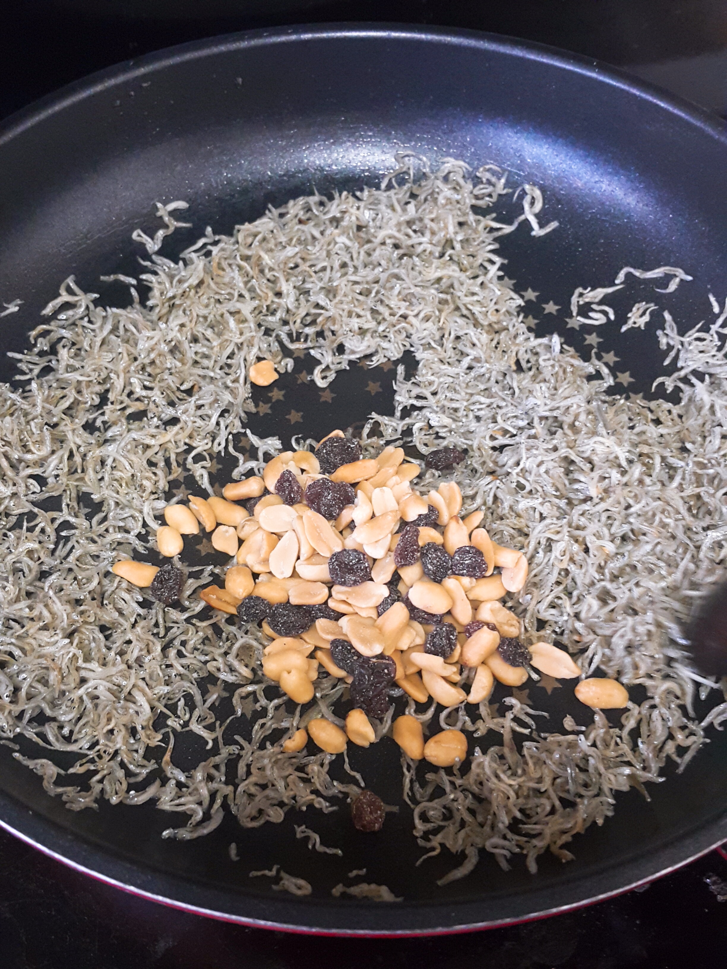 5. 멸치가 조금 볶아지면 땅콩, 건포도 등 넣고 싶은 견과류를 넣고 같이 볶아줍니다.