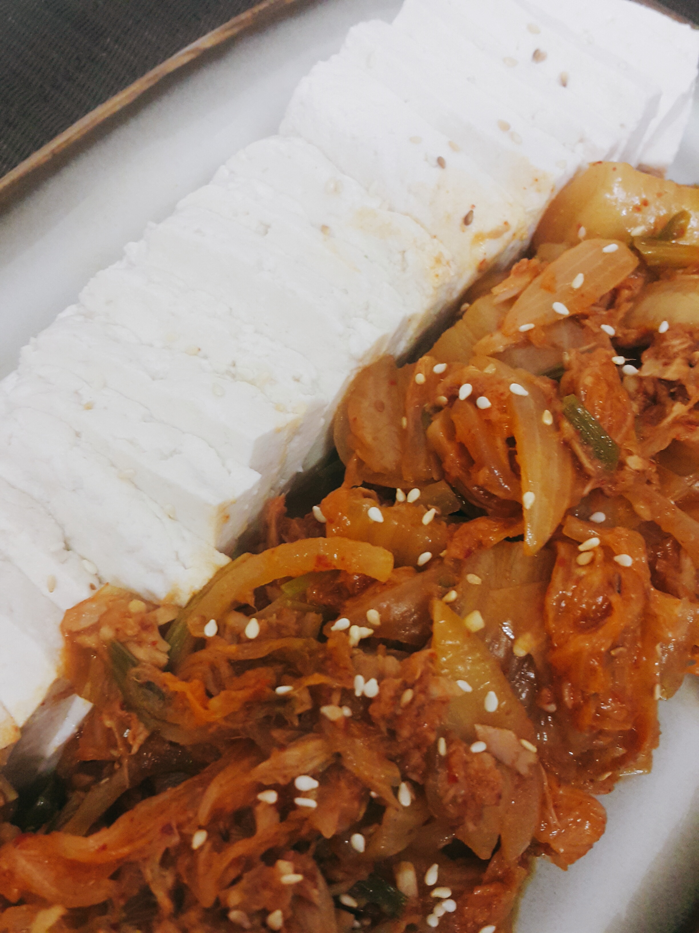 흰밥에 계란찜 하나에 두부김치 놓고 저녁 해결했어요~ 저희 초등학생 아이들도 잘 먹는 두부 김치예요~