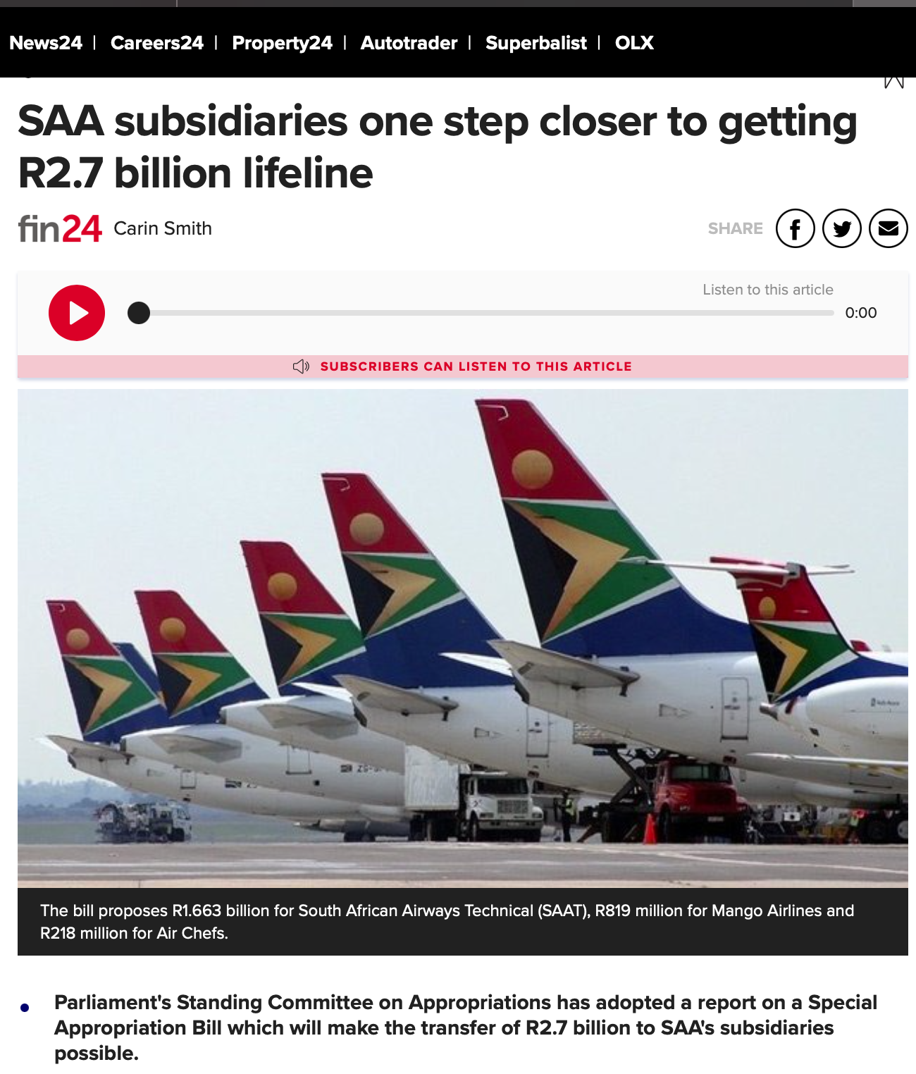 #) 2021년 특별지출승인법안(Special Appropriation Bill)에는 남아공항공에 R10.5 billion(105억 랜드)를 지원하는 내용이 포함되었다. 이 법안의 예산 중 27억 랜드(R2.7 billion)를 남아공항공 “자회사” 지원에 사용하는 내용이 포함되기도 했다.